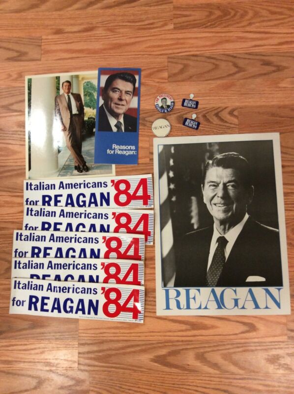 Title (ebay affiliate link): Ronald Reagan Photo 5 Bumper Stickers 2 Tabs 2 Buttons Poster Political Pamphlet