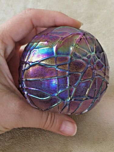 IRIDESCENT PURPLE THREADED PAPERWEIGHT GLASS HANDBLOWN RAINBOW
