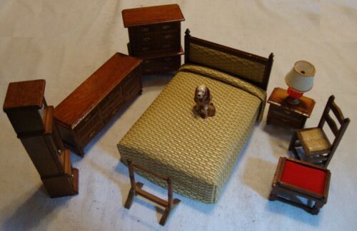 Title (ebay affiliate link): VINTAGE WOODEN DOLLHOUSE FURNITURE...COMPLETE BED ROOM SET & MORE (10) PC LOT