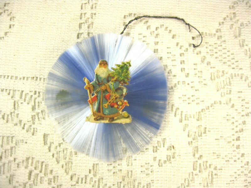 VINTAGE SPUN GLASS ROUND BLUE ORNAMENT WITH BLUE DIE CUT SANTA & ANGEL ON BACK