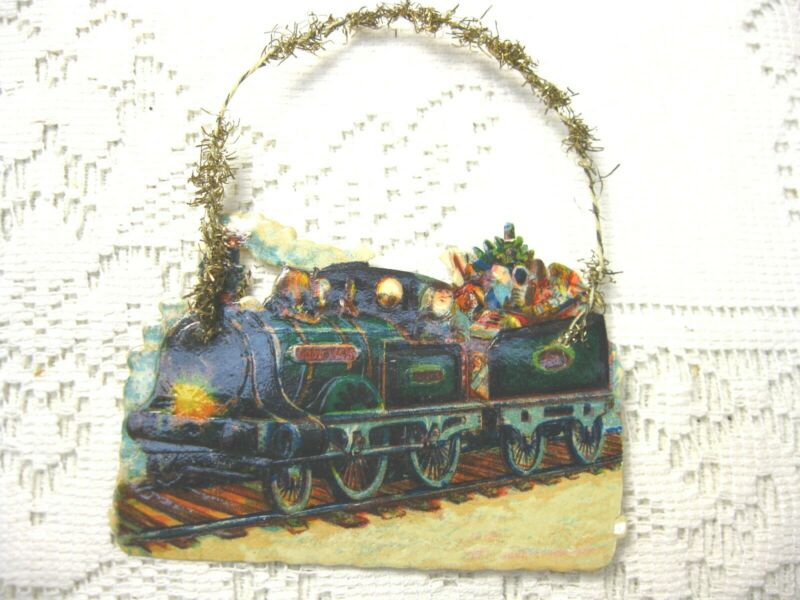 Title (ebay affiliate link): VINTAGE GERMAN DIE CUT BLUE SANTA TRAIN ENGINE XMAS TREE LOTS OF TOYS & PACKAGES