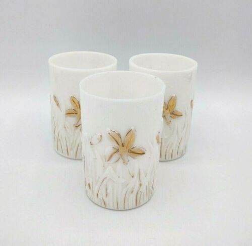 Vintage Set (3) White Milk Glass Tumbler Cups Embossed Gold Daisy Flowers