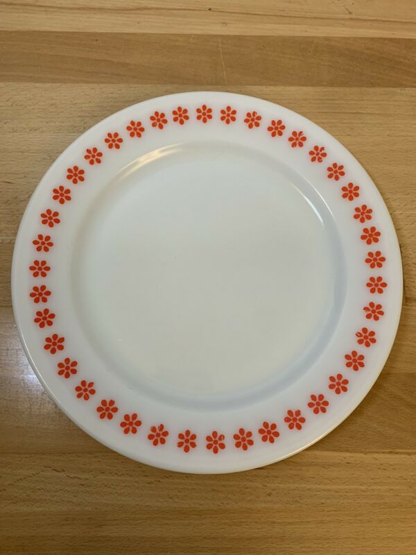 Title (ebay affiliate link): Vintage Pyrex Tableware Dinner Plate Milk Glass w/ RED Flower Trim - READ- USED
