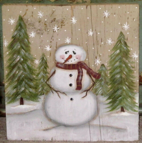 *~*PRIMITIVE*~* HP FOLK ART PRIM SNOWMAN *~* TREES *~* WINTER *~* RECLAIMED WOOD