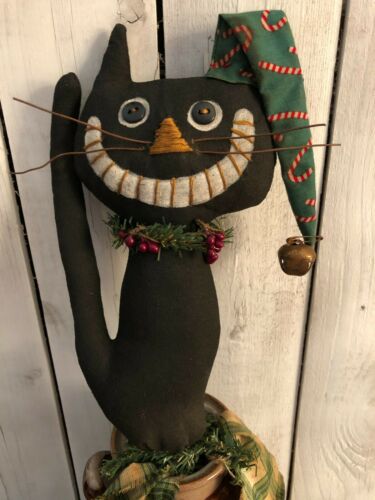 Primitive Doll Cat Doll Black Christmas Doll Folk Art Poke Santa Rusty Bell Wire