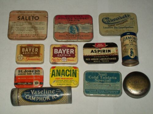 Title (ebay affiliate link): Vintage-Aspirin-Laxative-Medicine-Drugstore-Pharmacy-Tin-VERY POOR-LOT-of 12