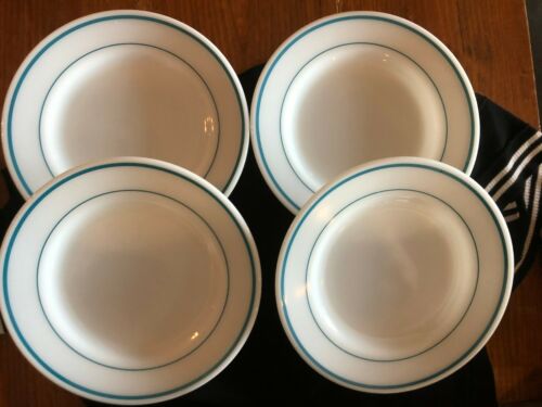 Vintage PYREX Tableware by CORNING Set of 4 Blue Stripe Milk Glass 9" Plates