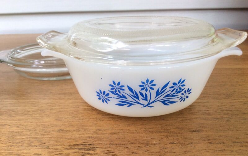 Title (ebay affiliate link): Vintage Fire King Anchor Hocking 12oz Casserole Dish & Two Lids Blue Flower