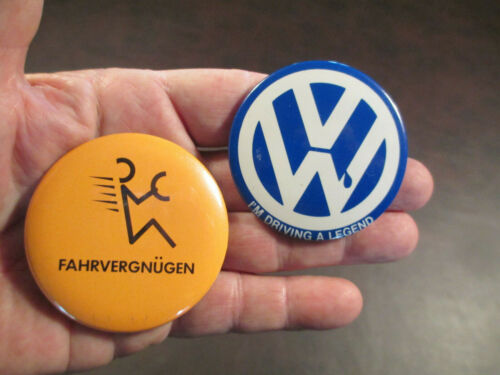 2 VINTAGE VOLKSWAGEN BUTTON PINS '' I''M DRIVING A LEGEND & FAHRVERGNUGEN ''