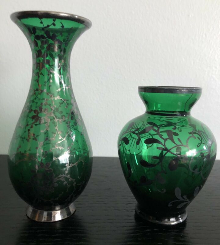 Green Glass Vases Lot Of 2 With Silver Overlay Hand Painted