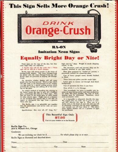 Title (ebay affiliate link): DRINK ORANGE CRUSH ADVERTISING SHEET ORDER BLANK IMITATION NEON SIGN 1920s ??