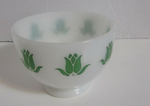 Title (ebay affiliate link): Vintage Fire King Oven Ware Green Tulips Footed Cottage Cheese Bowl