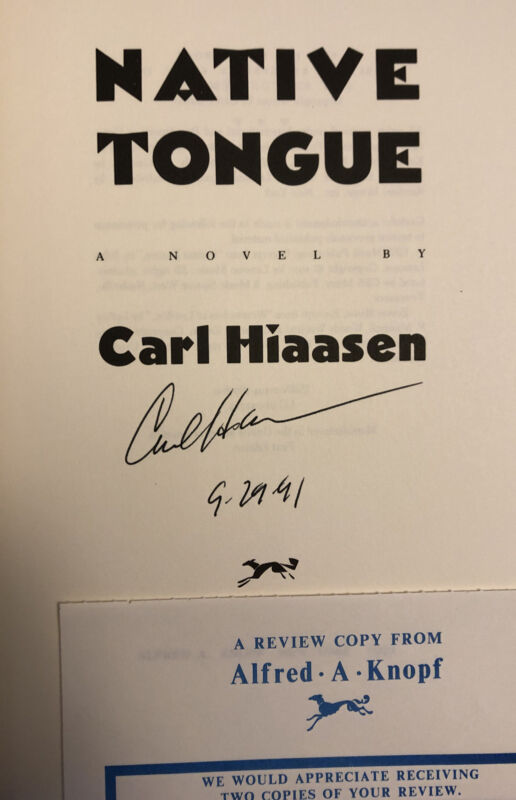 Title (ebay affiliate link): SIGNED by CARL HIAASEN - NATIVE TONGUE - 1st ed. (1991) REVIEW COPY in JACKET