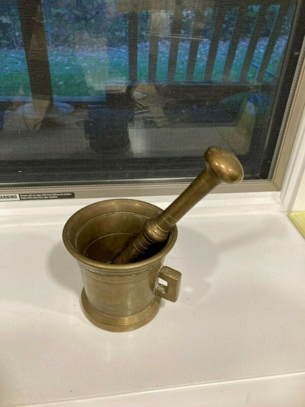 Title (ebay affiliate link): Antique Brass Mortar and Pestle, Apothecary 4 1/4 high 4 3/4 diameter 7.2 lbs