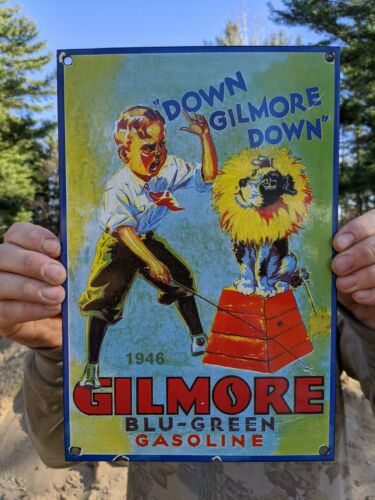 Title (ebay affiliate link): OLD 1946 GILMORE GASOLINE "THE RED LION" PORCELAIN SERVICE GAS STATION PUMP SIGN