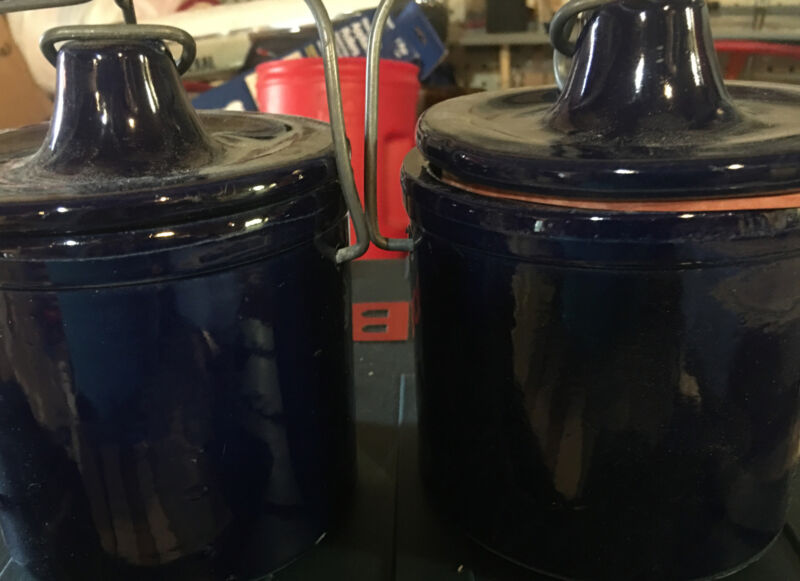 2 Dark Blue Crock Butter Cheese Vintage Crock Navy Cobalt Wire Bail