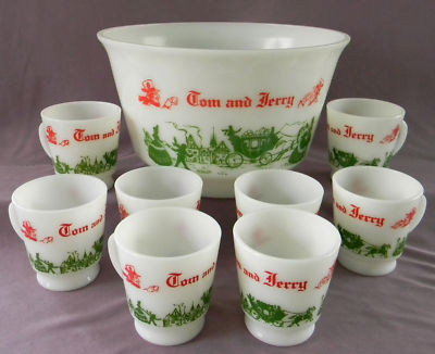 TOM&JERRY MILK GLASS HAZEL ATLAS EGGNOG PUNCH BOWL SET