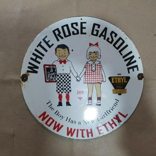 Title (ebay affiliate link): WHITE ROSE GASOLINE VINTAGE PORCELAIN SIGN 12 INCHES ROUND