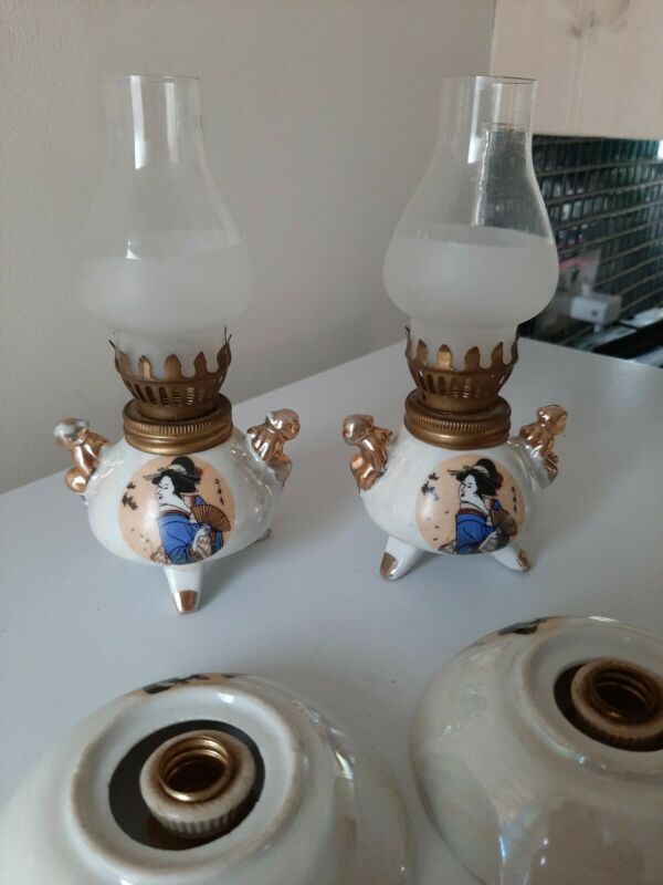 Title (ebay affiliate link): PAIR OF MINATURE PORCELAIN OIL LAMPS. CHINESE/JAPANESE GEISHA DESIGN. LUSTRE.