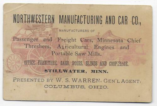Title (ebay affiliate link): Northwestern Mfg. & Car Co. Adv Trade Card Steam Power, RR Cars, Stillwater MN
