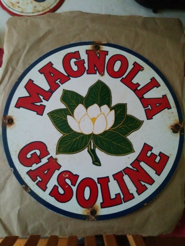 Title (ebay affiliate link): OLD VINTAGE MAGNOLIA GASOLINE GAS STATION ADVERTISING PORCELAIN SIGN