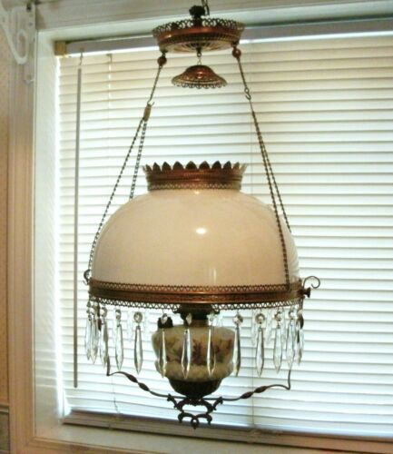 Title (ebay affiliate link): ANTIQUE VICTORIAN HANGING OIL LAMP w/ORNATE FRAME + 30 CRYSTAL PRISMS