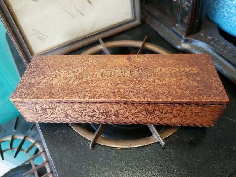 Title (ebay affiliate link): Antique Pyro-Art ~ Pyrography Glove Box with Oak Leaves Flemish Artwork & Gloves