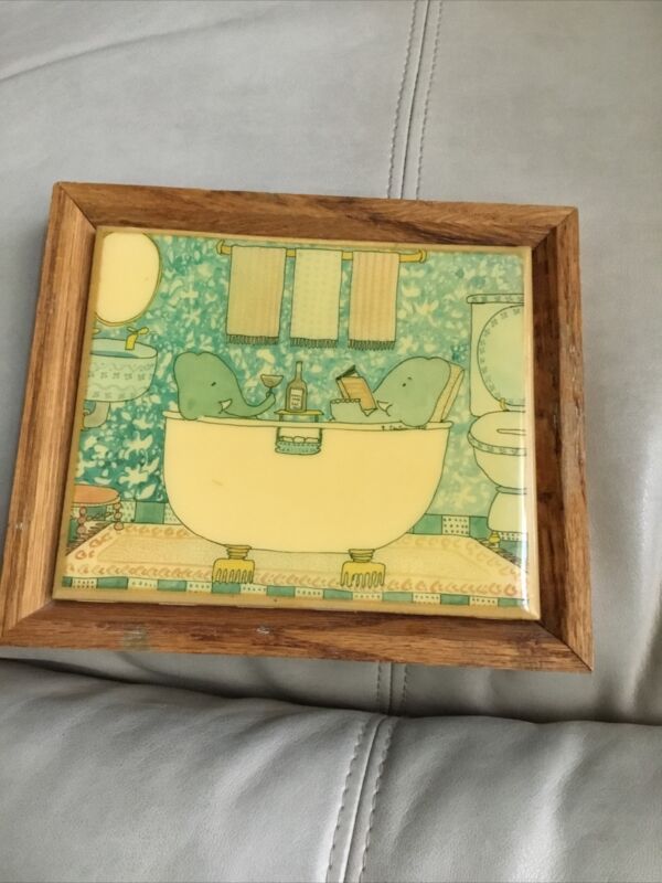 Title (ebay affiliate link): SUSAN GANTNER 1978 ELEPHANTS In The Tub Framed TILE ART 7 1/2 Vintage
