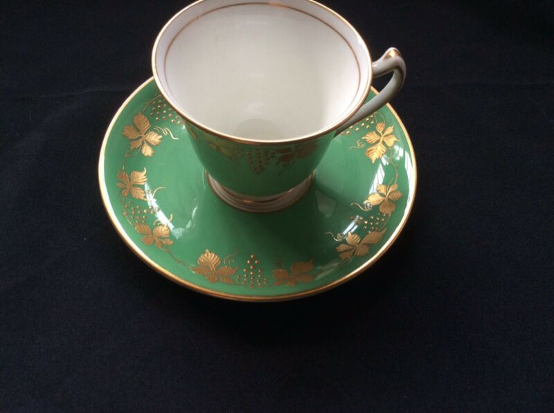 Title (ebay affiliate link): Antique Bone China Crescent Demitasse Tea Cup Saucer Gold Grapes Green England