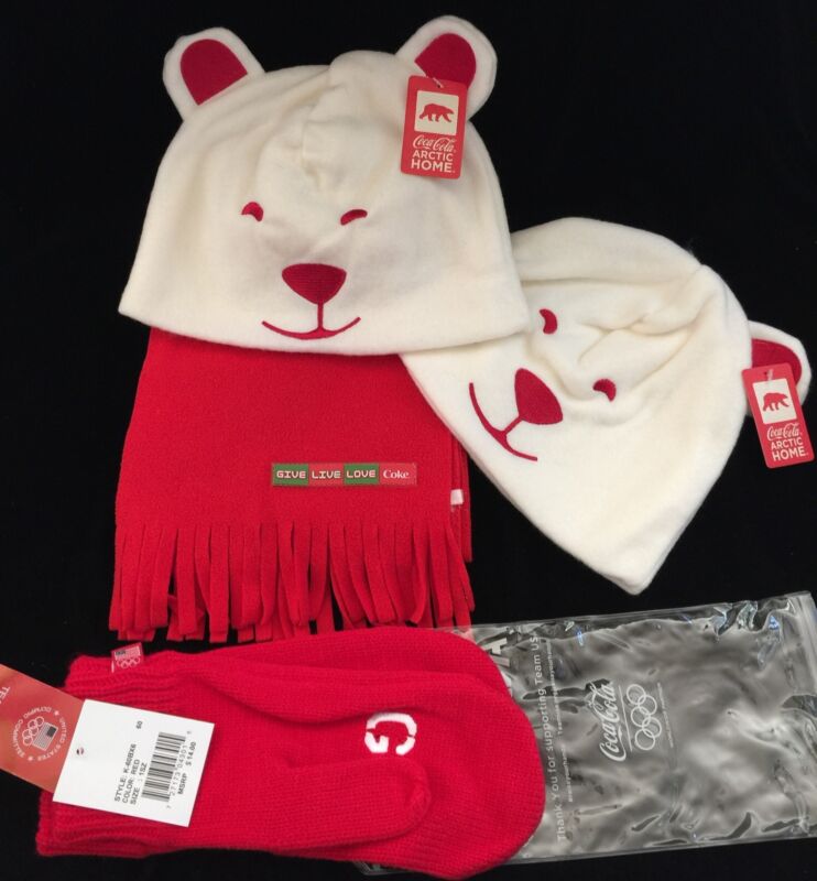 Title (ebay affiliate link): Vintage Coca Cola Coke Polar Bear Employee hat cap Scarf Mittens Give Live Love