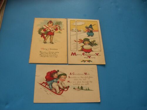 3 vintage Antique Postcard lot CHRISTMAS children KEWPIE snow sled 1921 1927