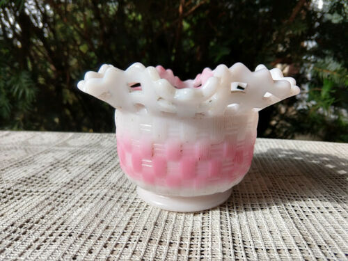 White milk glass bowl with pink hi-lites basket weave design lattice rim 5"
