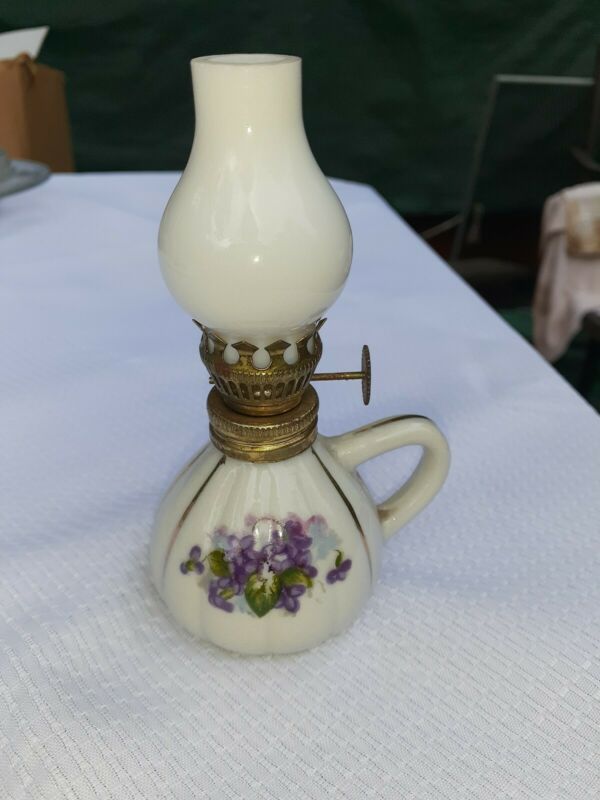 Title (ebay affiliate link): Vintage Miniature Oil Hurricane Lamp - Milk Glass- Handpainted Violets