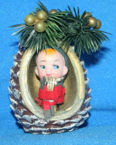 Title (ebay affiliate link): VINTAGE CHRISTMAS PIXIE ELF KNEE HUGGER DIORAMA PINE CONE ORNAMENT SHELF SITTER