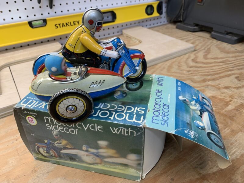 Title (ebay affiliate link): Clockwork Tin Wind-up Motorcycle with Sidecar MS709 Vintage