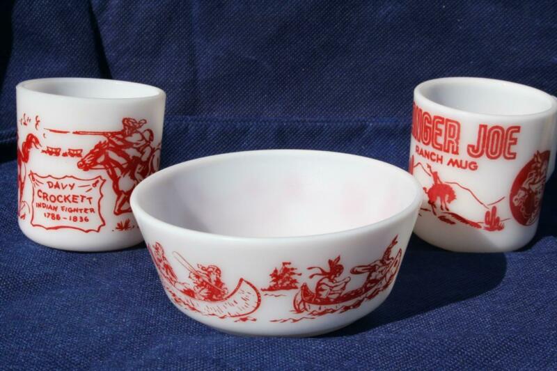 Lot of 3 Davy Crockett Hazel Atlas 2 mugs 1 bowl ~Milk Glass~ Nice Set!