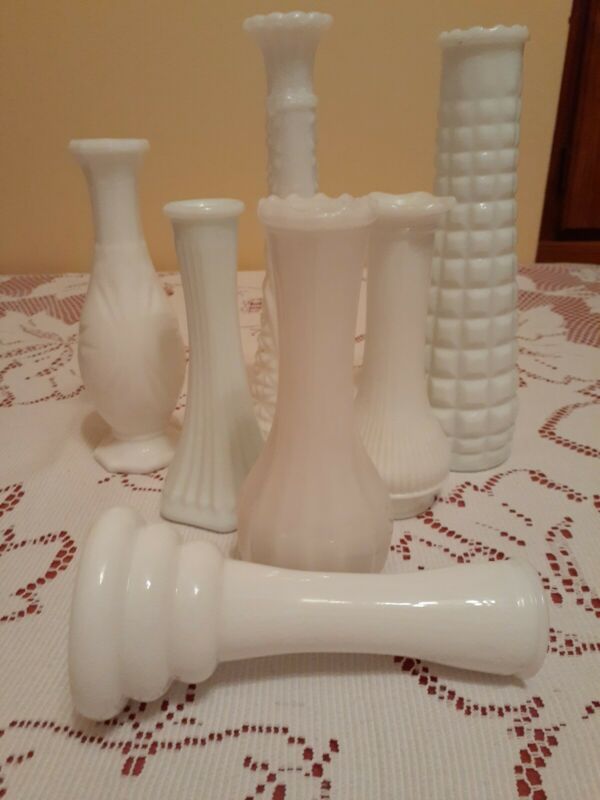 Title (ebay affiliate link): Vintage Milk Glass Bud Vases Lot of 7 - ASSORTED SHAPES, DESIGNS & SIZES - EUC