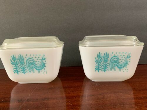 Title (ebay affiliate link): Amish Butterprint PYREX turquoise white vintage containers each 3 by 4 inches.
