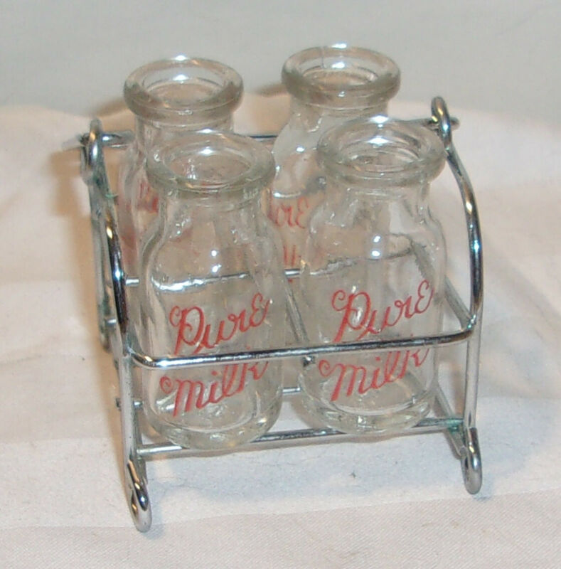 Title (ebay affiliate link): VINTAGE MINIATURE PURE MILK GLASS BOTTLES WITH CHROME METAL HOLDER