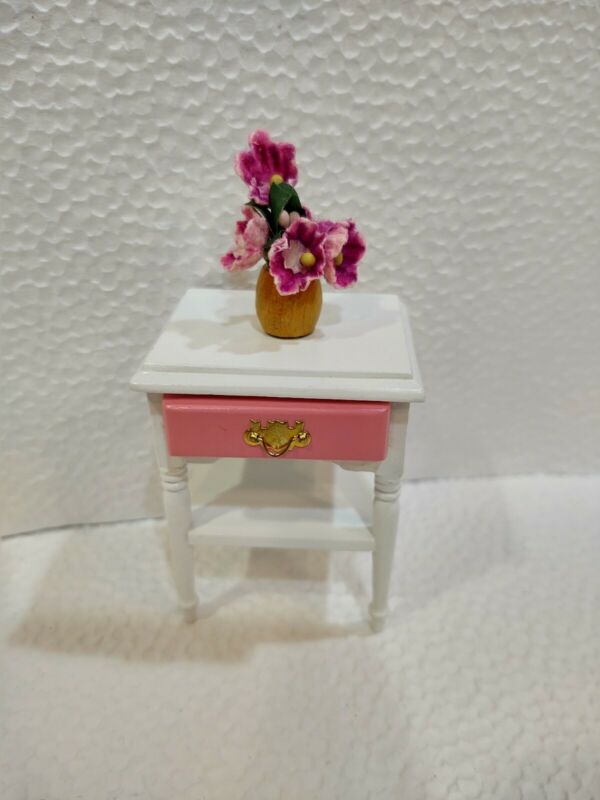 Title (ebay affiliate link): Wood BEDSIDE TABLE Pink/ White w/FLOWER in VASE Miniature Dollhouse Furniture