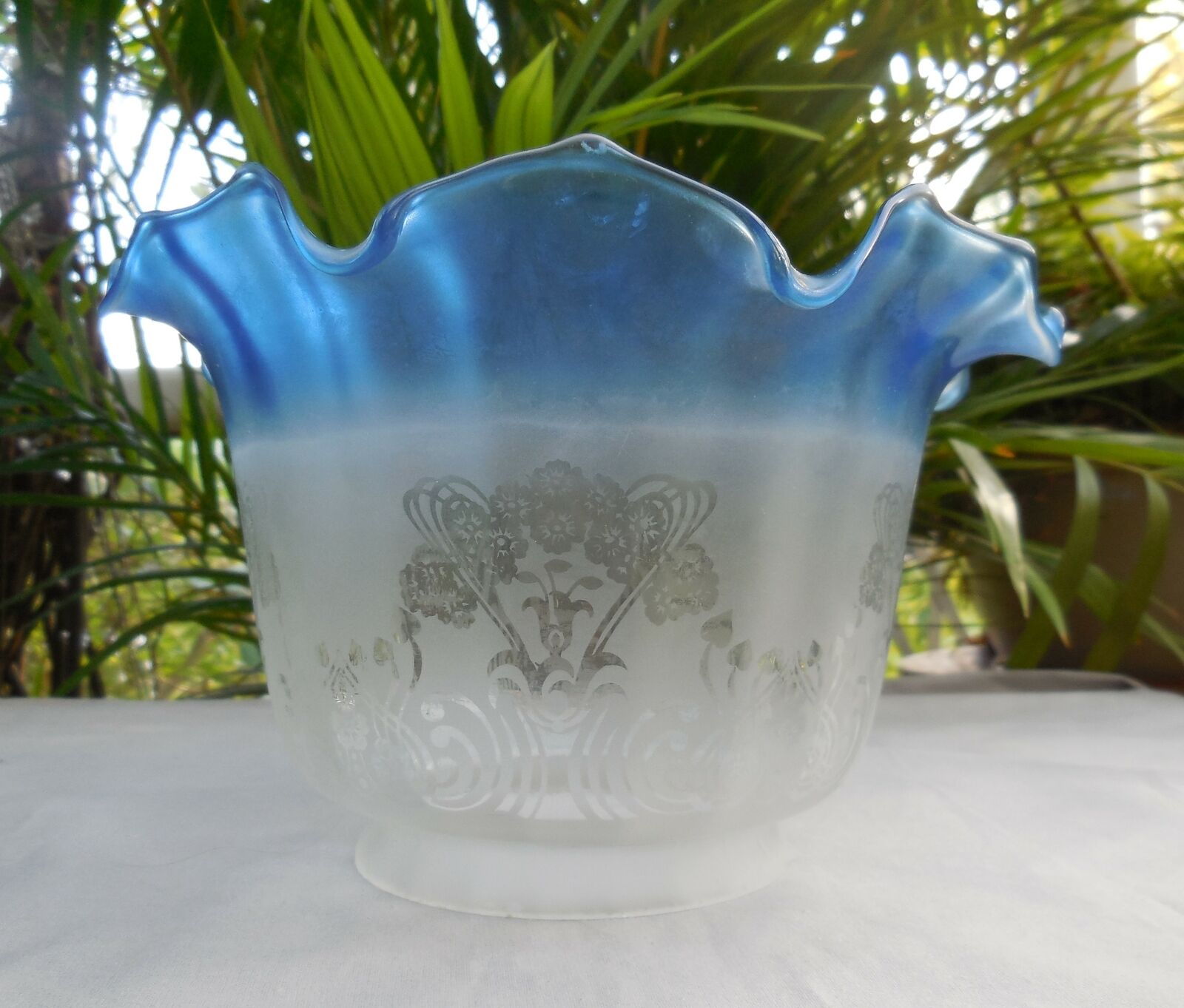 Antique Large Etched Fluted Blue Glass Oil Lamp Shade