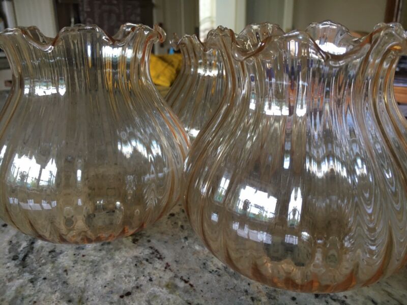 Three Gold Tinted Glass Round Tulip Shaped Ribbed Oil Light Lamp Shades Vintage