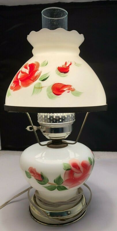 Title (ebay affiliate link): Vintage Milk Glass Hurricane Styled Table Lamp w/ Red Rose Floral Design