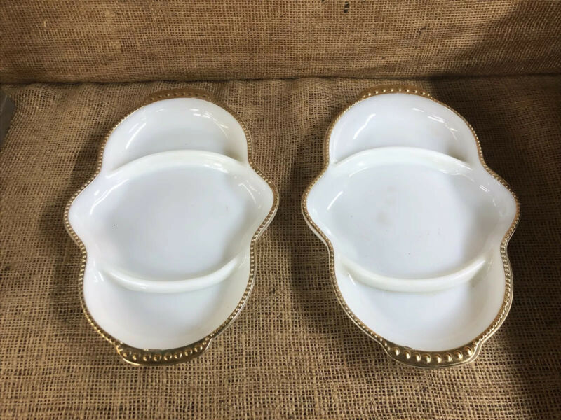 Title (ebay affiliate link): 2 Vintage Fire King Anchor Hocking Milk Glass Divided Relish Dish Gold Trim