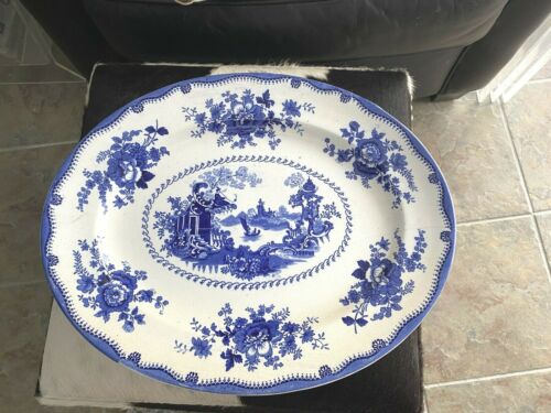 NANKIN BLUE & WHITE FLOW BLUE PLATTER LARGE OLD FLORAL ASIAN MUST SEE !!!