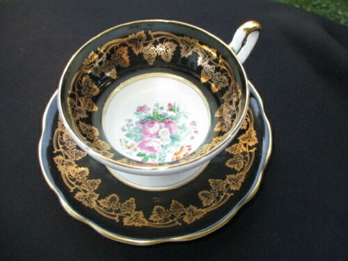 Title (ebay affiliate link): CUP SAUCER FOLEY BLACK & GOLD GRAPE VINE FLOATING ROSE BOUQUETS A STUNNER