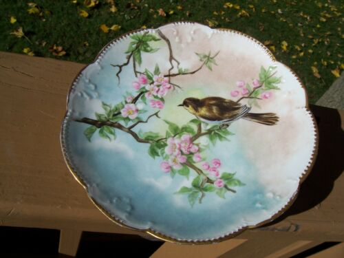 ANTIQUE PORCELAIN HAND PAINTED PLATE with flowers and bird w/ GOLD EDGES