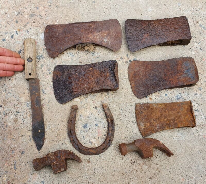 Title (ebay affiliate link): 18 Lbs mixed lot large rusty rustic double bit axe head hammer horseshoe knife