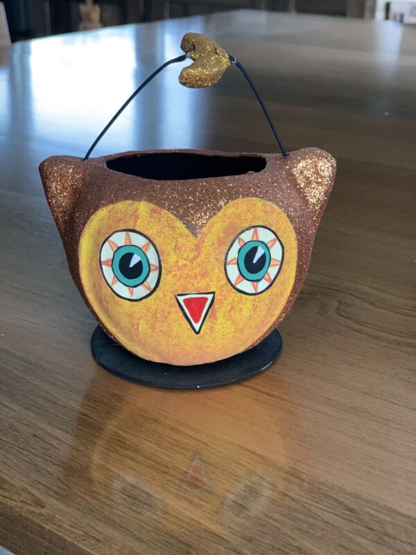 Title (ebay affiliate link): Department 56 Halloween Owl Paper Mache Candy Pail Glitter