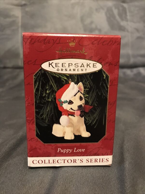 Title (ebay affiliate link): Hallmark Keepsake Ornament Puppy Love 1999 Puppy with a Christmas Hat